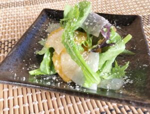 柿と大根は相性が良いので、大根の歯ごたえがあった方が良いアクセントになると思います。また、葉ものはどのようなものでもよいと思いますが、ルッコラがあるとより高級なサラダになります。ドレッシングは、今回市販のフレンチドレッシングを使いましたが、シーザーや中華ドレッシングにも合います。簡単なので、是非色々工夫してみて下さい。